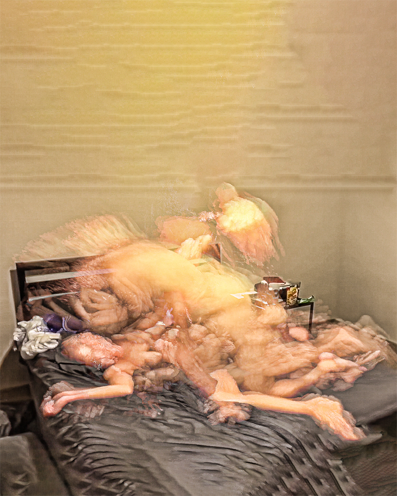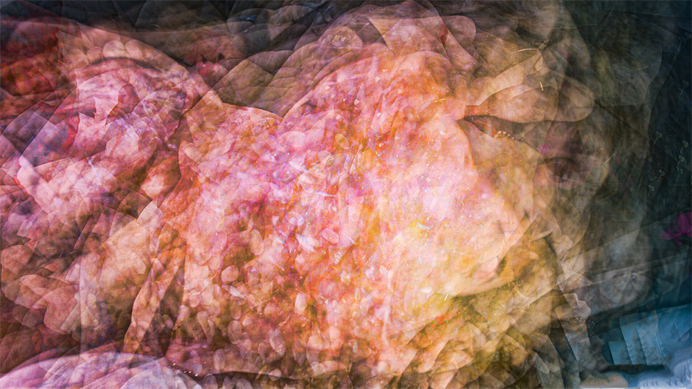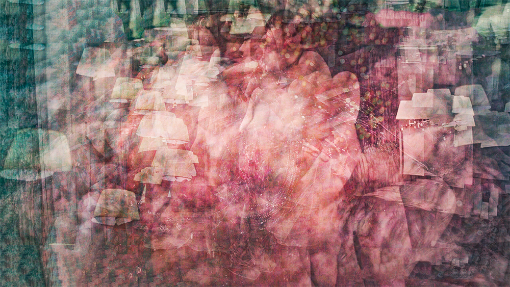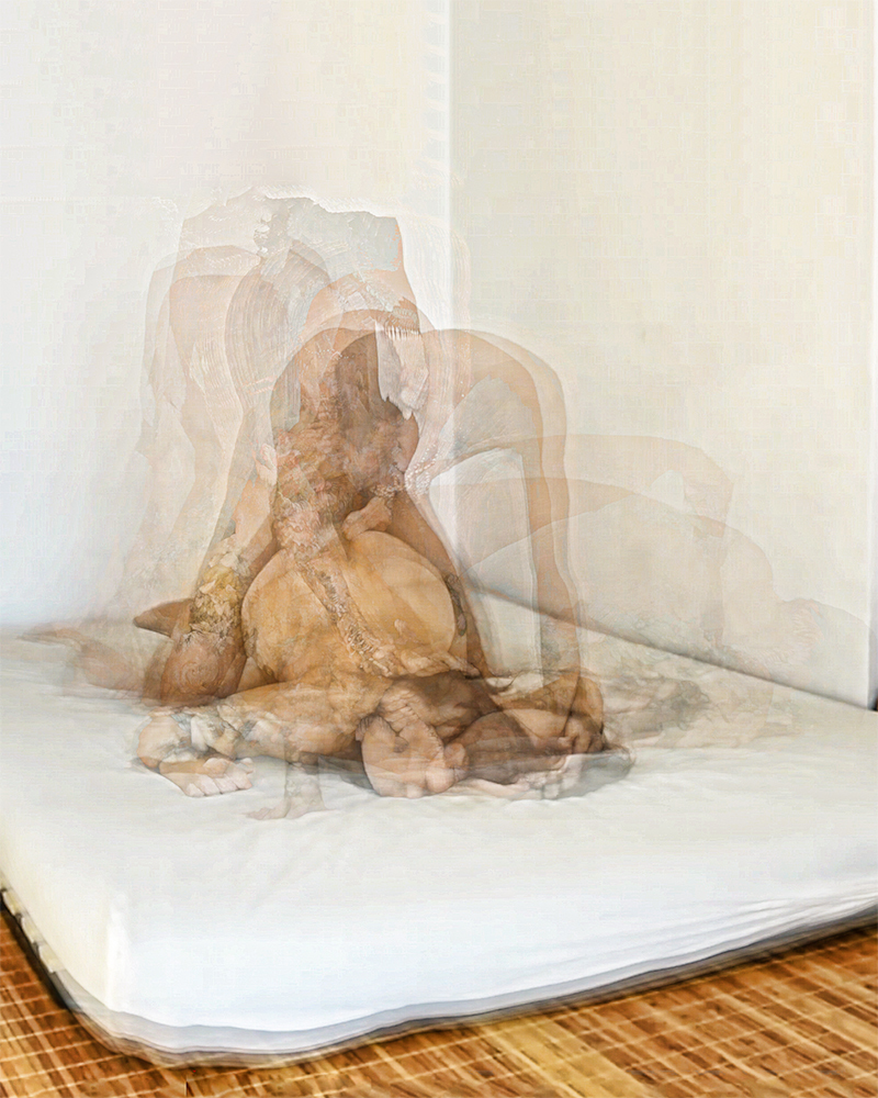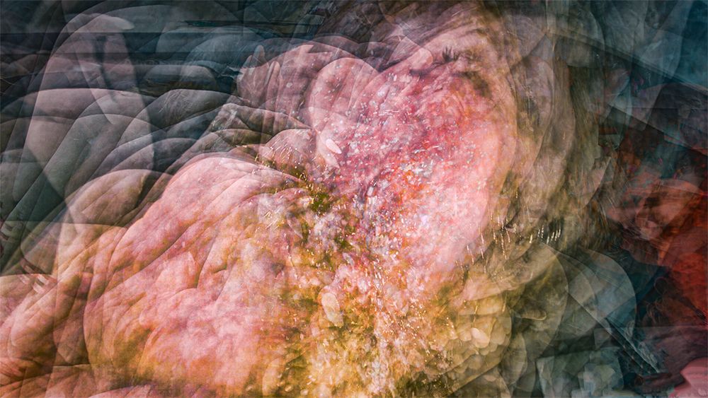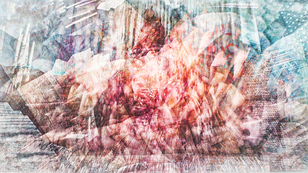 インターネット上に存在するポルノ動画を約5000枚の画像に一旦解体。その後、すべての画像を積層することで1枚の画像として制作しています。