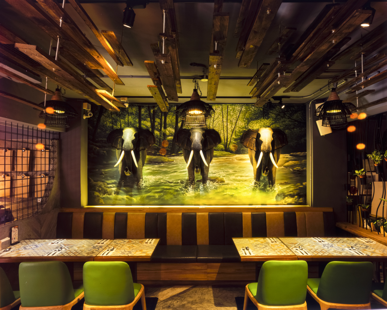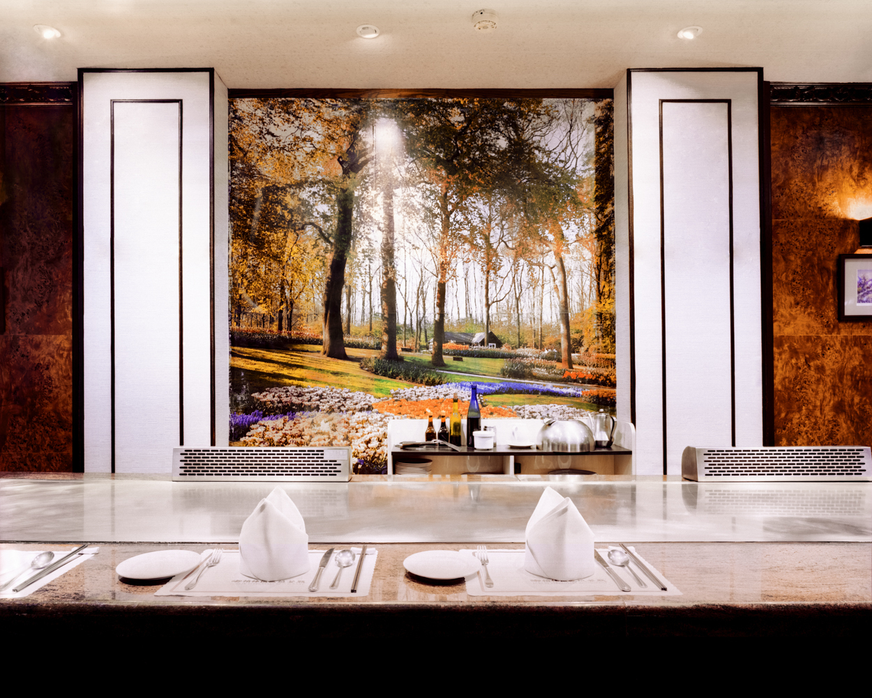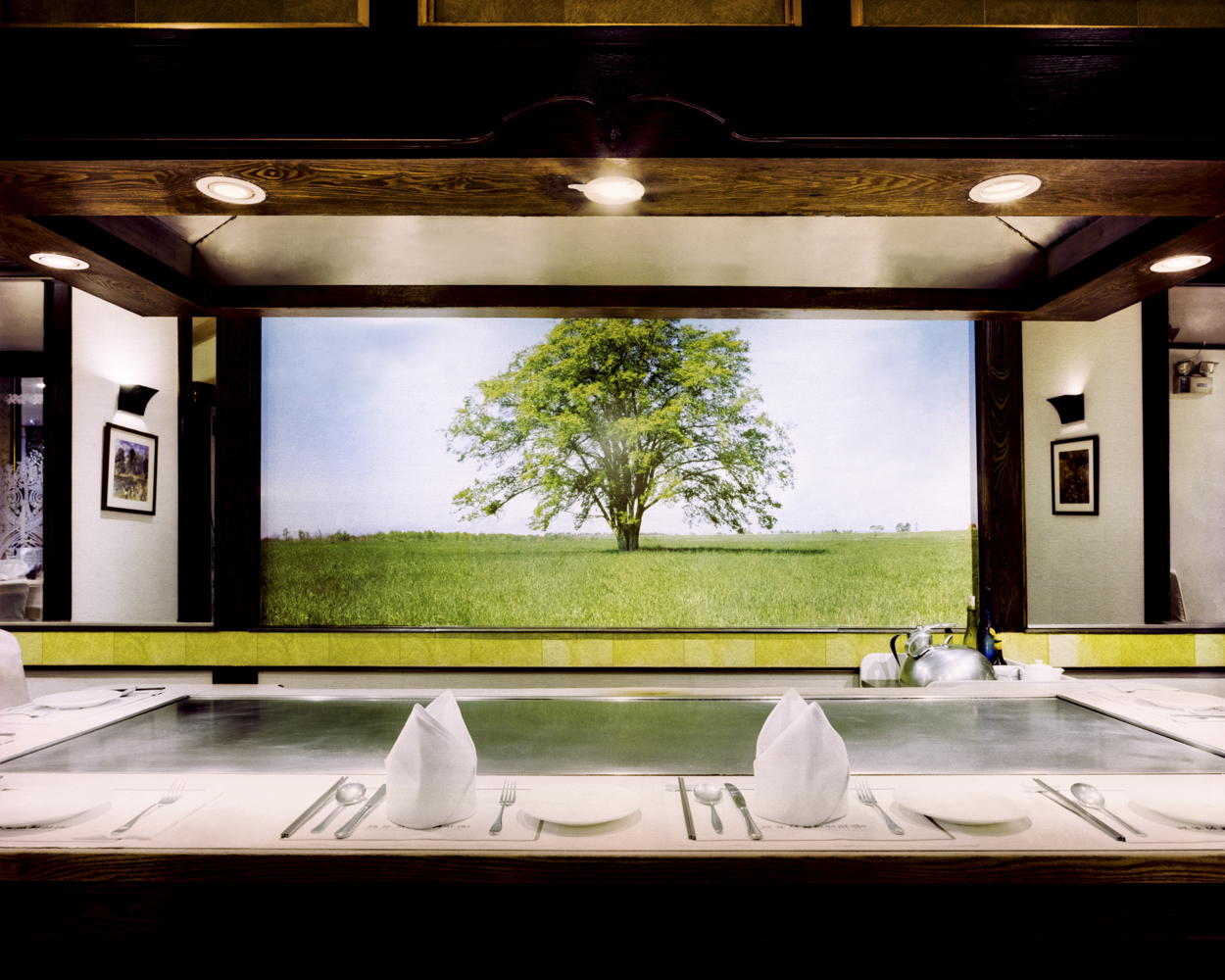 野餐系列的作品,使用4x5相機拍攝。我觀察到一種視覺文化現象,屬於台灣人的浪漫,以大型風景照做為用餐空間的佈置,大自然的風景照,圖片來自網路圖庫,老闆透過風景照意圖使客人產生移情作用,讓客人有種在自然中用餐的心情感受,另一方面這也與做生意的風水有關,老闆常會挑跟水有關的象徵財,跟山有關的象徵是有靠山,我將此現象類型搜集,呈現空間與風景照之間的關係,體現了一種台灣人的風水文化與視覺文化的樣貌。