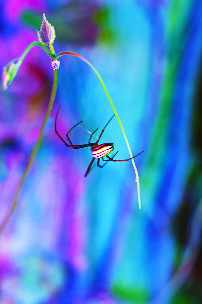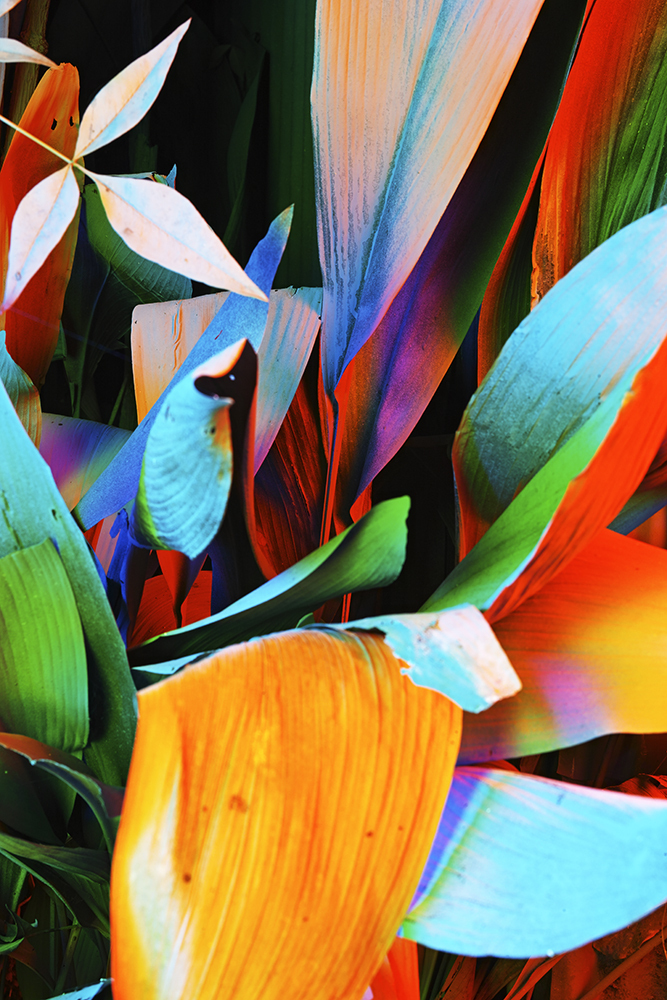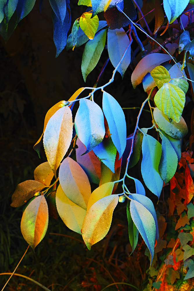 The garden is painted *gray and photographed at night with various colors of light. New green leaves and insects appear in the gray landscape, which has been illuminated in extreme colors.