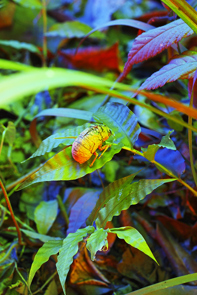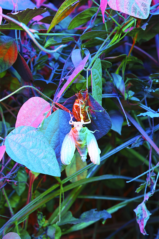 庭を*灰色に塗って、夜に様々な色の光を当てて撮影している。極彩色に彩られた灰色の景色に、新しい緑色の葉や虫が現れる。